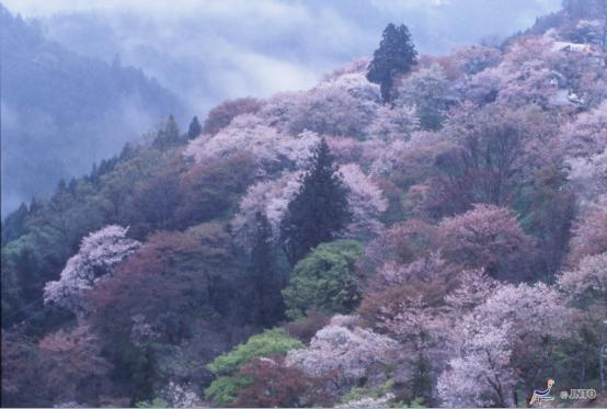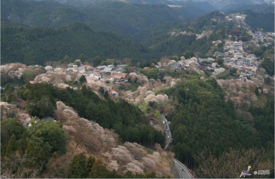 具有世界遗产之称的吉野山是日本最有名气的赏樱胜地之一,来到这里,眼里除了樱花还是樱花。站在观景台望过去,漫山遍野都是樱花。这里因被樱花包围,还有“一目千本”之称。