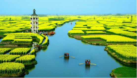 江苏兴化位于长三角经济带北缘,建城已有2300多年历史,是江淮地区的一颗水乡明珠,有着深厚的文化积淀和独特的水乡美景。“兴化千岛菜花”位于兴化市缸顾乡,以千岛样式形成的垛田景观享誉全国。每年4月,在辽阔的水面上,千姿百态的垛田形成了上千个湖中小岛,岛上开满金灿灿的油菜花,在水面上形成一片金黄色“花海”,一望无际,令人叹为观止。