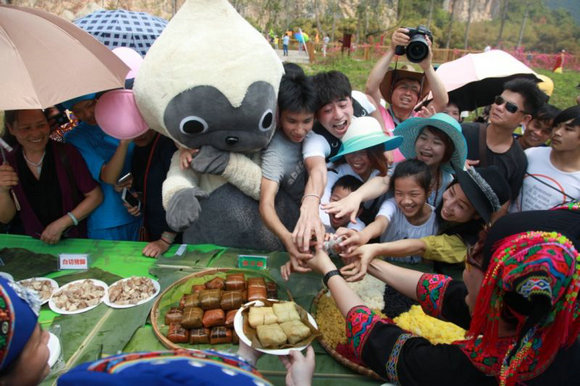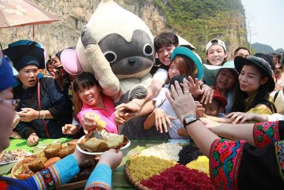 这其实也不能怪“小白”。吃,绝对是了解风土人情的一种方式,而在广西的“三月三”节里,除去人气旺盛的民俗活动,特色美食也格外挑动人的味蕾。玲琅满目的食品让人眼花缭乱,在庙会,在路边,在店里,只要是有食物的地方全都排起了长队,大家迫不及待的想要来一场美味的盛宴。而如果在“三月三”参加壮家夜宴的游人,一碗香气宜人的五色饭,一碟甜甜的壮家血肠,加上自酿的“土炮”老米酒,会让你更加感受到浓浓的节日氛围。这是一场盛大的聚会,饮食丰盛不说,壮家歌舞也是不可或缺,身着壮族盛装的壮家男女老少们,进行着独具民俗特色的歌舞表演。舞龙、舞狮,及壮家人特有的板鞋竞走、打陀螺、抛绣球等演出活动也都粉墨登场。