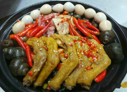全州醋血鸭,是桂林全州的一道特色美食。采用盛夏上市的子鸭为原料,杀鸭留血、注入酸醋,以嫩姜或苦瓜为配料,将鸭肉先武、再文火焖熟,在出锅前倒入醋血。成品上桌时,块块油光闪亮,满盘香气四溢,既无腥味又酸得刚好,美味让人难忘~