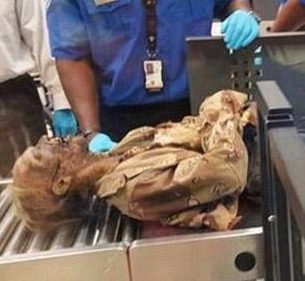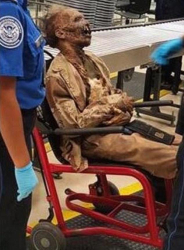 当时,这名不同寻常的干尸“乘客”躺着通过了X光机,让检查的安检员吓了个半死。然而,当安检员们发现它只是2003年版本的恐怖电影《德州电锯杀人狂》里的道具时,都松了一口气。