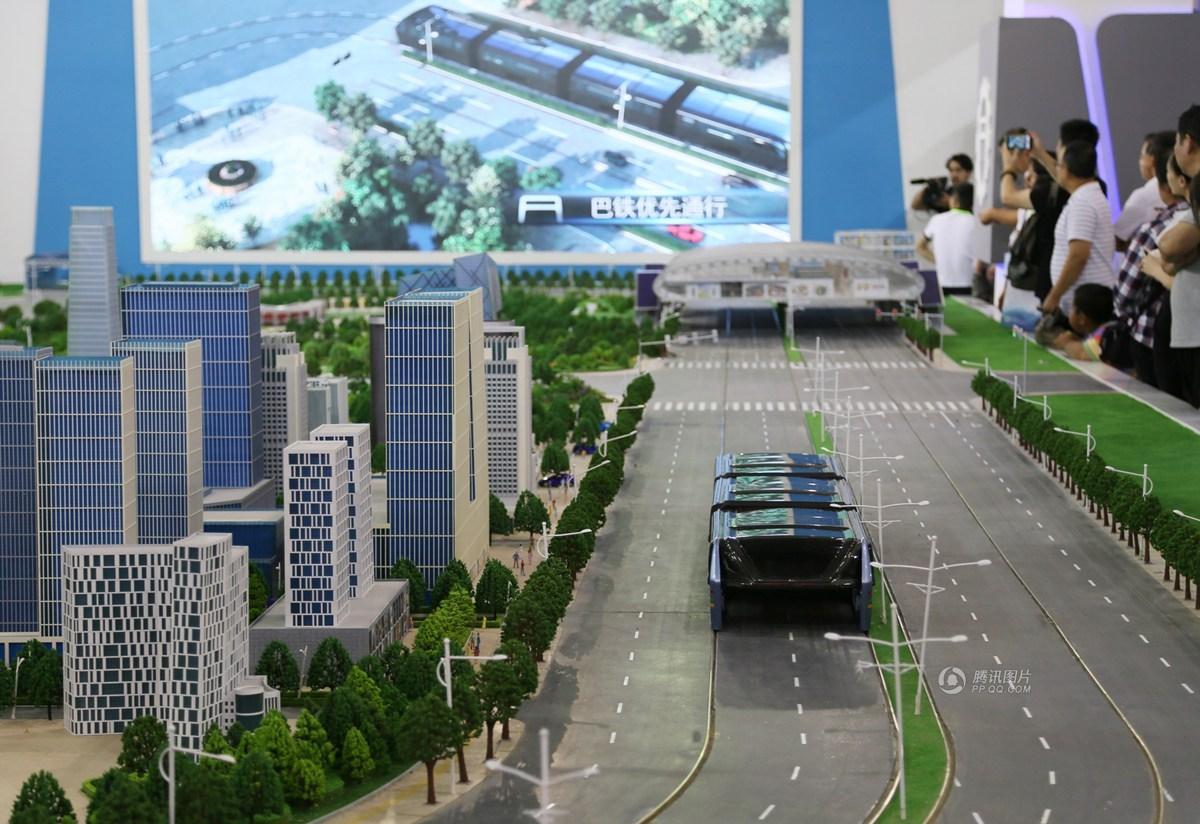 在第十九届中国北京科技产业博览会上,一项名为“巴铁”的中国原创发明惊艳亮相,这是一种完全依靠电力驱动的大运量宽体高架电车。也被称为“空中奔跑的巴士”和“陆地空客”,具有地铁一样的大运力,还能像巴士一样在地面上运行。图为“巴铁”模型。南山/视觉中国