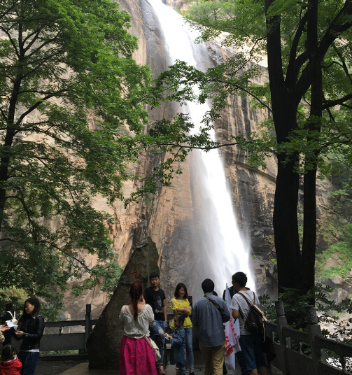 一路阅,一路观,大咖们走过长800米的洞天隧道,渡过长80米的白云吊桥,领略了花岗岩构造的地貌景观千尺崖,在水流轻缓的青龙瀑布留下纪念影像。再沿石阶而下,只见落差达123米的九龙瀑布舞动着雄壮的身躯倾泻而下,气势如虹,水波四溅。因在九龙瀑布的岩壁上天然镶嵌着九条明显的石英岩脉,状如九龙嬉瀑,因而得名。就这样,水光山色相映成趣,活脱脱成就了一幅幅大自然着笔的墨彩山水画。
