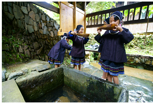 侗寨的凉亭多建于山坳或路旁,供行人乘凉歇息之用,亭畔多古树遮荫。坐在凉亭的长凳上,喝着纯净的泉水,浑身疲劳顿消。