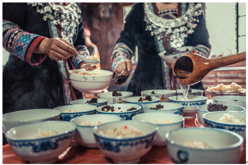 糯米,炒米花,蜜红豆,加上热乎乎的油茶水,就是一碗风味独特的油茶。别问主人家怎么只给你发了一根筷子,这里面是“一心一意”的寓意。在鼓楼里等待一碗油茶和一块热糍粑的诞生,绝对是种幸福的体验。