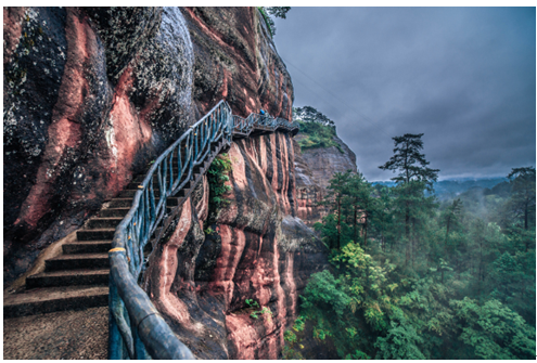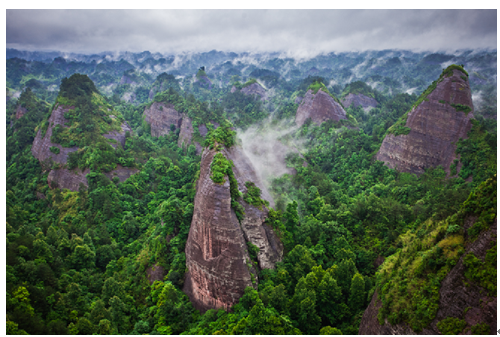 景区最高峰大寨岩海拔高658米,宽800余米,是一座丹霞巨石。四周群峰林立,怪石嶙峋。细看之下,石壁之上竟嵌着一座高百余米天然“佛像”,体态匀称,神势肃穆,令人心生敬畏。