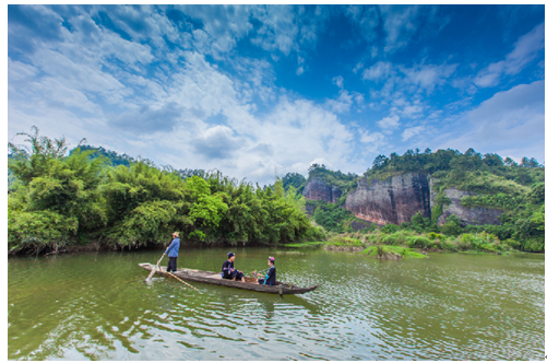 舟行水面,扑面而来的是座座青山。这山都是平地而起,直插在沿河两岸。乘船漂流,可以一饱玉带河的奇山秀水,听艄公哼一曲山歌小调,讲一段民间传奇,甚是惬意。