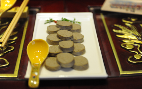 这道其貌不扬的菜就是蒸鹿尾儿,是一道满族独有的美味。把新鲜猪肝儿剁烂、过箩,加入香油、芝麻酱、松子、花生等20余种作料,灌进鹿肠衣,煮(蒸)熟。现在鹿肠衣很难找了,都是用猪肠衣代替。这道菜是个功夫活儿,吃起来细腻香滑,不比国外的鹅肝酱差哦。