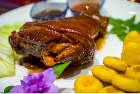 接下来就要说说这招牌的福寿肘子了,光这红亮的外表就让人垂涎三尺了。这里的肘子都选用的是当地散养黑猪的前肘,整个制作过程长达两天一晚,因此才能做到入口软香,肥而不腻。