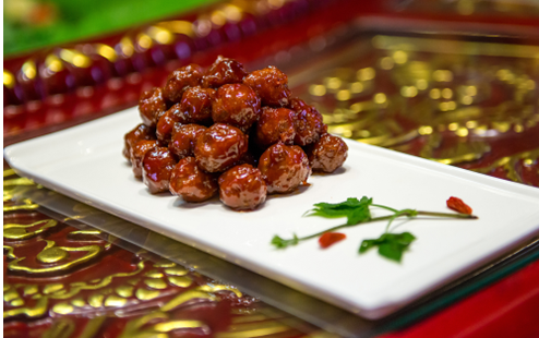一品鹿肉丸,鹿肉剁碎做成丸子,甜酸口的酱汁将整个丸子包裹了个结实,如果偏咸口一点可能更好。