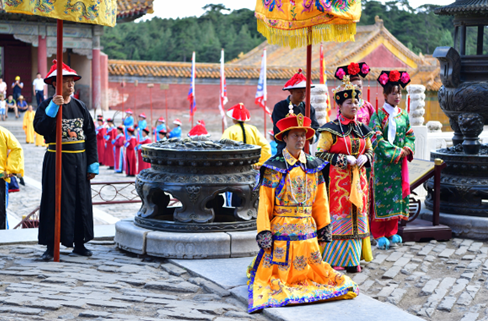 整个仪式由“乾隆”皇帝率领王公大臣等四十余人在庄严、肃穆的乐典声中进行,尽可能的还原了祭祀原型。入场仪式中,抬号角、举星、立瓜、八旗仪仗等人身着清代服饰入场,列阵排开。迎神、敬香、复位、跪叩等仪式一一再现。演出场面隆重,逼真地再现了历史的原貌。烈日当空,演员们穿着古装,一丝不苟,辛苦而敬业!
