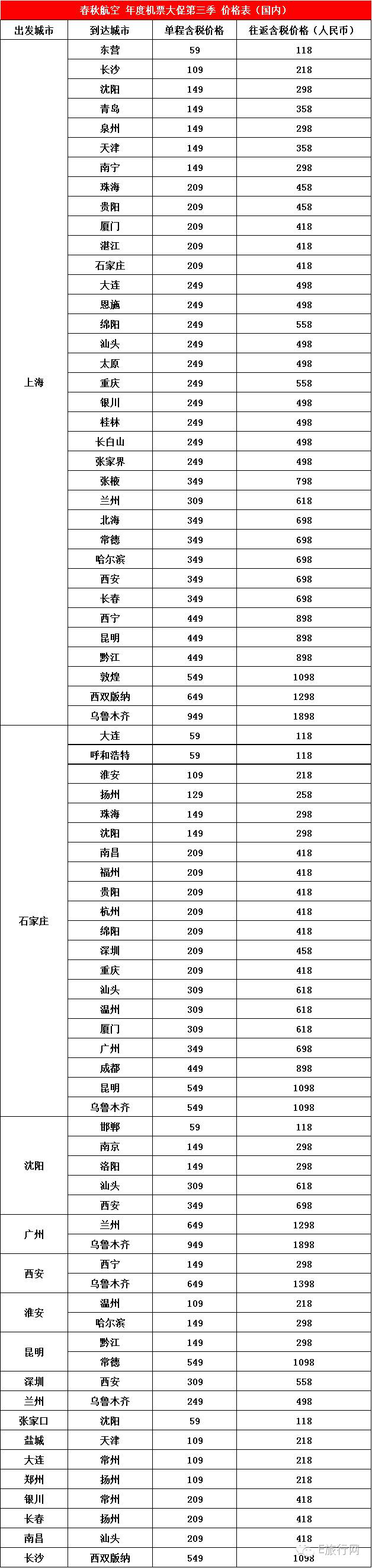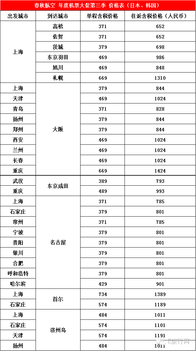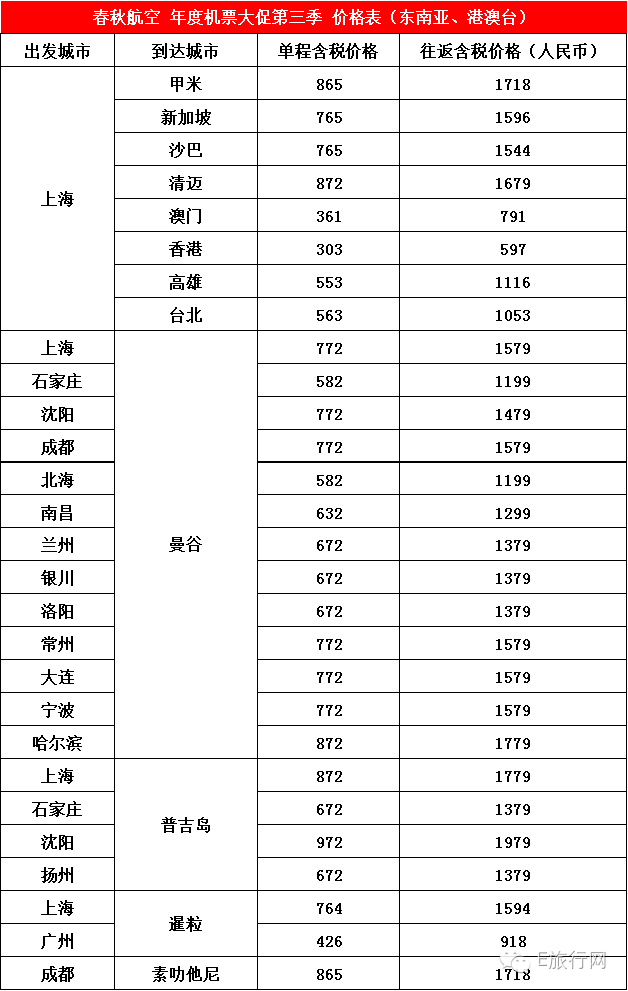 春秋航空年度机票大促第三季如约而至,就在8月9日上午10点,全场机票促销最低仅1元起,出行日期包含8-12月,时间超长,促销包含了日本、韩 国、泰国、柬埔寨、新加坡、马来西亚、香港、澳门、台湾和国内多个城市,童鞋们不要错过啦!由于春秋航空官网公布了参与航线的未含税价格,为了方便大家, 在此小 E特意为小伙伴们整理了本次促销的详细价格表,供大家参考!