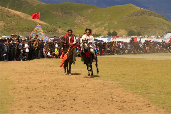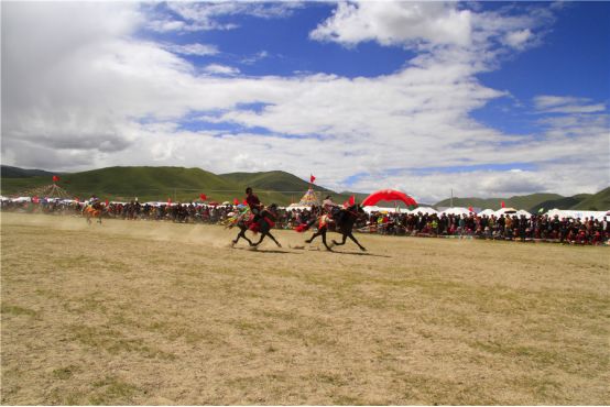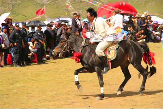 一匹匹膘肥体壮的骏马载着英姿飒爽的骑手,在稻城湛蓝的天空下为参加此次活动的游客们带来了一场视觉盛宴。马术表演中,骑手们身手矫健,他们身着节日盛装,奔驰的姿态潇洒轻捷、飘逸绝伦,在马背上不时变换着高难度的骑乘动作,有的旗手甚至双手高举洁白的哈达,双手放开缰绳,仅用娴熟的骑猎技巧驾驭全力疾奔的赛马,自信与喜悦尽荡漾在骑手的脸上。