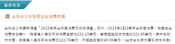 再从消费角度来看,大陆游客在台湾人均消费已经超过日本,成为人均消费最高的游客来源。同样,易读财经查阅台旅会公布的统计显示,2015年一到三季度大陆旅客每人每日在台湾平均消费金额为232.15美元,首度超越日本旅客的221.45美元。其中在购物方面,大陆旅客每人每日的平均消费约为122.78美元,亦超越日本游客的40.06美元,是日本旅客的3倍还多。根据此数据,有台湾经济学者就曾进行估算,假设大陆游客1年减少100万人次,以平均日消费232美元、平均消费6至7日来计算的话,台湾一年恐怕会少赚450亿元新台币,对GDP会造成0.32个百分点的冲击。