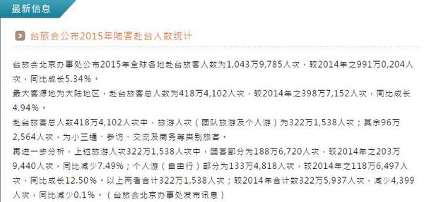首先,从量级上来看东南亚或日本游客远不如大陆游客。易读财经查阅,根据台旅会数据显示,2015年全球各地赴台湾旅客人数为1043.97万人,最大客源地为大陆地区,去年大陆赴台旅客总人数为418.41万人,在总游客中的占比高达40.07%,是2008年赴台游客的近14倍。