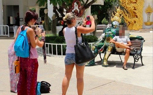 据泰国《世界日报》援引经理报报道,泰国清菜白庙主人察霖猜大师表示,近期又发现一些外籍游客在白庙做出不文明行为,特别是部分西方游客,在与寺庙椅子上的钢铁侠合影时,喜欢搂抱、亲吻及用手抓钢铁侠,导致该雕塑严重受损,有的西方游客甚至用脚指着佛堂里的雕塑让朋友看,这种行为在佛教场所中是被禁止的。