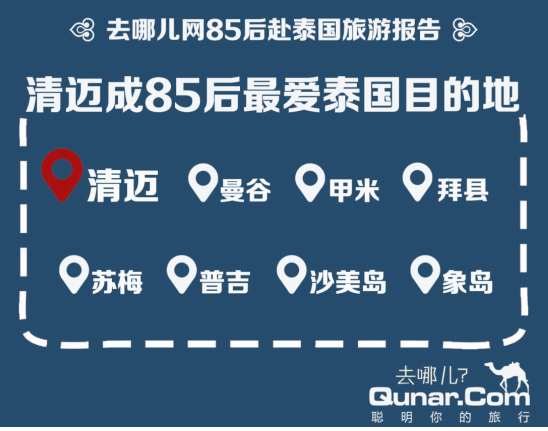与传统游客最爱曼谷、芭提雅不同,85后年轻人更喜欢带有文艺、小清新标签的目的地。报告显示,40%以上的85后第一次去泰国旅游时,会选择清迈、拜县作为其中一站。清迈夜市、清迈大学、水灯节等旅游IP受欢迎。泰国最受85后年游客欢迎的地点为:清迈、曼谷、甲米、拜县、苏梅岛、普吉岛、沙美岛、象岛、芭提雅。