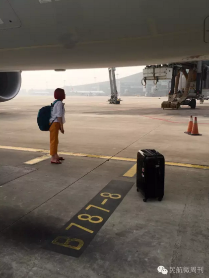 图为该女性旅客,拉着行李强行拦在托车前面,当时登机桥已经撤出。