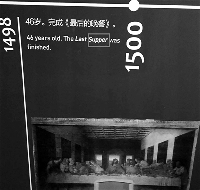 该网友发现,在这个介绍达·芬奇生平的年表上,英文错误不止一处:关于达·芬奇46岁的经历,展览介绍说:“46岁。完成《最后的晚餐》”,其对应的英文翻译是“46 years old. The Last super was finished.”而super一词在英文中的意思是“超级的”,“晚餐”的英文词汇实为supper,该翻译中少了一个字母“p”。