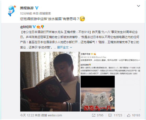 “旅游中这种放水爱国有意思吗?”19日,携程旅游微博转发了这一消息,并调侃这种行为是“放水爱国”,大量网友跟帖热议。