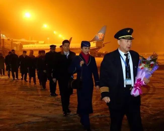 截至2016年1月1日,南航新疆分公司以安全飞行61年保持中国民航最高安全纪录。图为2015年最后一个航班的机组成员走下飞机。