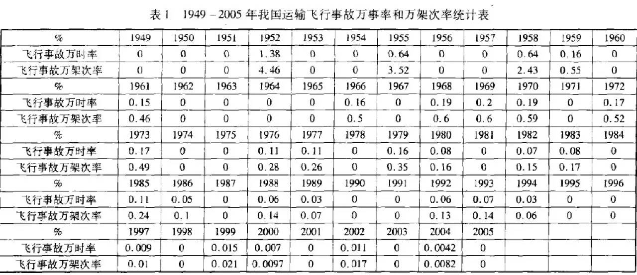 1949-2005年我国运输飞行事故万时率和万架次率统计表。
