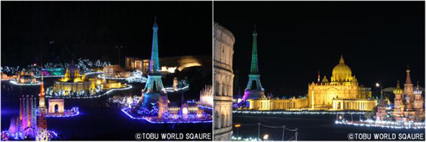 “东武世界广场”内,21个国家共计102座建筑按1/25的比例完美再现,其中有46座为联合国教科文组织认证的世界文化遗产。灯光秀期间,这里的每一座建筑都将挂上绚丽的彩灯。全球第一高塔东京晴空塔®以及去年新参展的台湾地标——超高层建筑“台北101”大楼、埃菲尔铁塔、米兰大教堂、金字塔等著名建筑的彩灯将同时点亮,营造出一个梦幻的世界。
