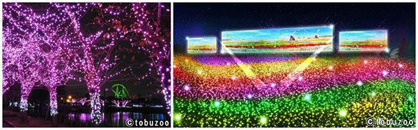“东武动物公园 冬季灯光秀”今年将迎来第8个年头,届时园内将被大约200万盏LED彩灯装扮得五彩缤纷。不仅如此,今年特别将去年使用的LED投影增宽到20m以上,再配合着动感十足的CG影像,广场上铺设的LED将同时绽放出各色光芒,上演一场精彩的音乐灯光秀。此外,围绕园内东门天鹅湖的樱花树,在彩灯的装饰下在冬季中再次“绽放”,游乐园区也会被绚丽的彩灯装扮一新。活动期间,还计划举办由动物们带来的彩灯花车和“星光动物花车巡游”表演,以及圣诞期间限定的“驯鹿节”。