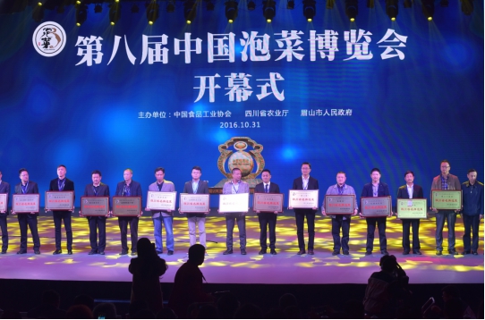 在开幕式上,现场还进行了盛大的颁奖和授牌仪式。中国烹饪协会正式授予眉山市“中国东坡美食文化名城”称号,并现场颁发牌匾。备受瞩目的中国泡菜十大经销商评选结果也正式出炉,省市领导向四川吉恒食品有限公司、上海本巧实业有限公司、大连晴天贸易有限公司等2015年全国泡菜10大经销商进行了颁奖。同时,参会领导还现场向“东坡泡菜文化遗产传承人”授牌,并授予四川吉香居食品有限公司“吉香居牌香菜芯”、成都新繁食品有限公司“老坛酸菜鱼全料”、四川味聚特食品有限公司“口口脆榨菜”等“四川名牌泡菜”荣誉称号。