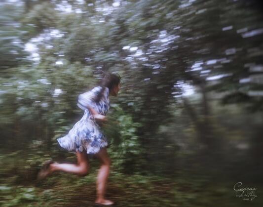 拍摄当天是一个阴雨的天气,天空阴沉,偶尔会有小雨,拍摄的时候还是边撑伞边拍摄,主题这组选的是一个逃跑的主题。突出人物的动感,速度感。拍摄选在一个树林中,为了使主体突出,就用动感的模糊效果反衬出逃跑的主体。