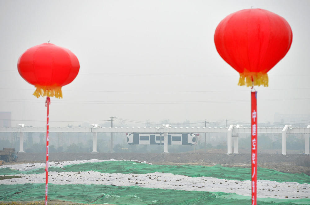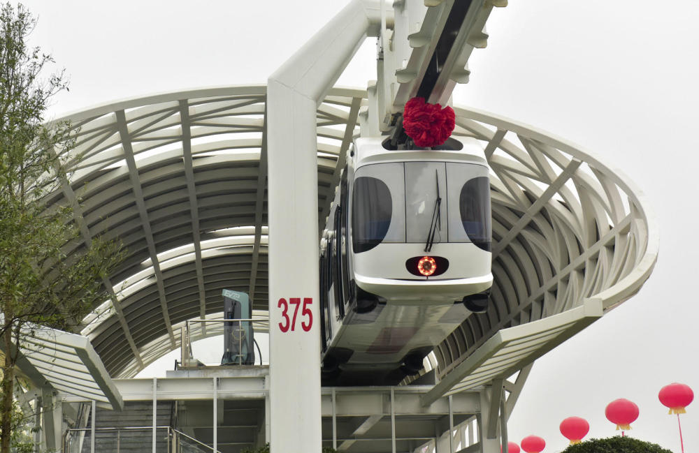活动现场,翟院士与四川省相关领导,以及中铁、中车等相关研发、生产企业负责人将一同登上新能源空铁列车体验。富有四川特色的“熊猫”列车悬挂在高架轨道上,以近60公里每小时的速度,平稳行驶。