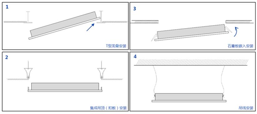 为适应不同办公空间的照明需求,“朗逸III”直下式LED平板灯”具有三种规格尺寸,四种安装方式,分别为 T型龙骨安装、集成吊顶安装、石膏板嵌入安装和吊线安装。