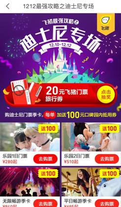 记者在飞猪App的活动页面上看到,来到页面的飞猪会员即可抽取20元旅行券,该券在购买上海迪士尼各类型门票时可以直接抵用,相当于立减20元。同时,上海迪士尼度假区飞猪旗舰店里显示,购买12月10日-12日入园的门票,还可获赠100元口碑抵用券,可以用于在迪士尼园区内消费。