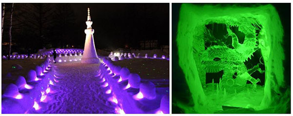藏王温泉滑雪场将于2016年12月23日—2017年3月5日期间,举办长达52天的“树挂冰雪祭”,为“雪怪”树挂点亮盏盏明灯。在寂静而漆黑的夜幕中,五彩斑斓的灯光使树挂更加姿态分明,与白天的晶莹透亮各自成趣,令人仿佛误入了幻象迷宫。活动期间,还将同时举办乘坐夜之巡洋舰号游览“树挂梦幻走廊”的活动。在配有暖气的新型雪上列车“夜之巡洋舰号”的特制车厢中,可以更近距离地观赏璀璨灯光下的树挂及雾凇。(全天预约制,最早可提前7日预约。预约电话:+81-23-694-9518)