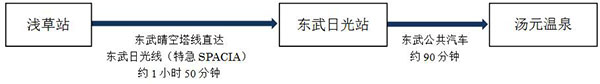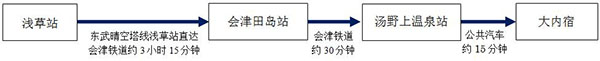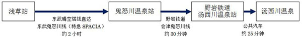 ※从浅草站乘东武晴空塔线快速列车,则无需在鬼怒川温泉站换乘,约3小时即可到达汤西川温泉站。
