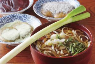 用一整根大葱代替筷子来食用的荞麦面是大内宿地区的著名美食。