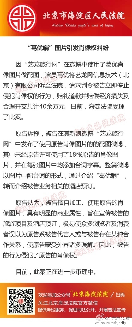 因“艺龙旅行网”在微博中使用了葛优肖像图片做配图,演员葛优将艺龙网信息技术(北京)有限公司诉至法院,请求判令被告立即停止侵犯肖像权的行为,赔礼道歉并赔偿经济损失及合理开支共计40余万元。《法制晚报》记者(微信ID:fzwb_52165216)上午获悉,日前,海淀法院受理了此案。