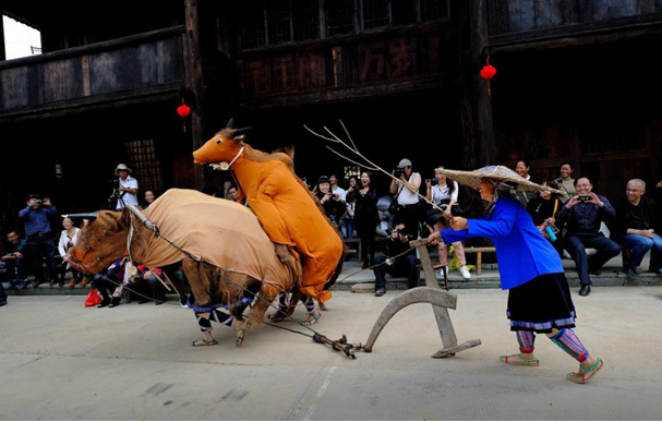 闹春牛是侗家新春文化活动的主要形式。春牛由竹篾和彩布编制而成,扎一个牛头和一个牛尾,牛头、牛角糊上绵纸,画上牛眼,牛身用一块黑布或灰布连接起来,由身手灵巧的健壮小伙舞动,后面跟随着扶犁耙、手执牛鞭、扛锄头、提鸭笼、背鱼篓等一大群人,一路敲锣打鼓载歌载舞,模仿着劳动的场景,既是庆祝头年的丰收,又通过拜节的形式祈求来年的风调雨顺。