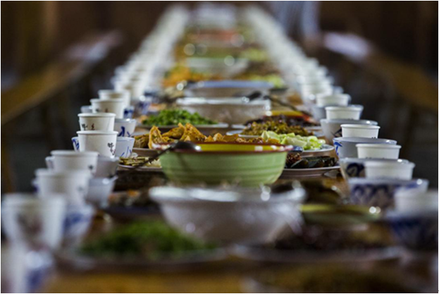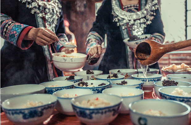 合拢宴最能体现侗家人的热情好客,欢聚团圆!一张张木桌椅首尾相连,腌制的鱼、肉、鸭等酸菜及小炒配上自酿的苦酒满满地摆上餐桌招待远方的来客。合拢宴上,侗家阿妹两人一对或三人一群,手捧酒杯,向客人敬酒,歌不停,酒不断,让你感受何谓有客必有酒,有酒必有歌。