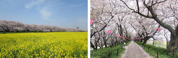 春日一到,千米长的河堤上千余株染井吉野樱花竞相绽放,枝干交错搭建出一条美丽的“樱花隧道”。河堤旁边满是盛开的油菜花,樱花的淡粉与油菜花的明黄形成鲜明对比,震撼您的视觉。每年3月下旬至4月上旬,樱花盛开之时,这里都会举办“樱花节”,不仅有百余家美食摊档云集于此,还会举行丰富多彩的活动。“樱花节”期间,交通便利,东武会增开区间巴士,往返于附近的幸手车站和幸手权现堂樱堤所在的县营权现堂公园之间。