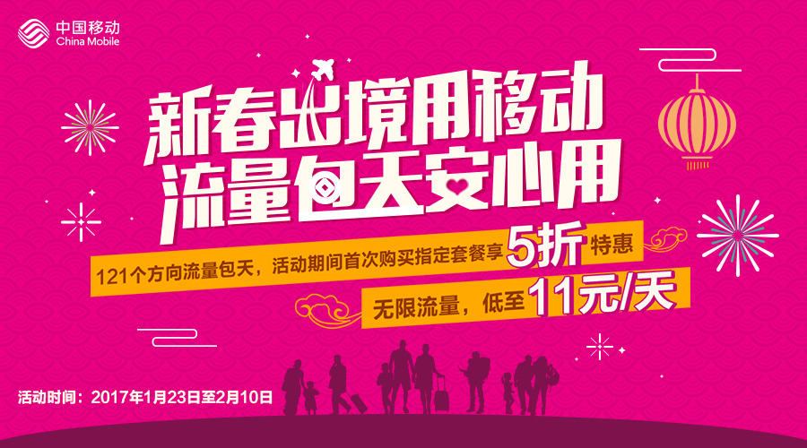 出境旅游恰逢新春佳节,用中国移动的新春境外流量包,把快乐分享给全世界。