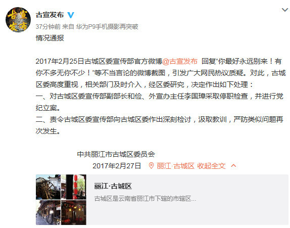 2017年2月25日古城区委宣传部官方微博@古宣发布 回复“你最好永远别来!有你不多无你不少!”等不当言论的微博截图,引发广大网民热议质疑。对此,古城区委高度重视,相关部门及时介入,经区委研究,决定作出如下处理:
