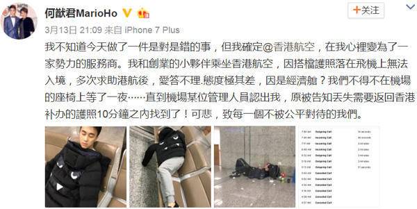 3月13日晚间,名为“何猷君MarioHo”的网友在微博发布消息称,自己与朋友搭乘香港航空,因护照遗落机上,导致无法入境。而后向香港航空求助无果,被告知护照丢失需要返回香港补办,导致其滞留在机场过夜。并称香港航空对其“爱答不理,态度极其差”,“因是经济舱?”