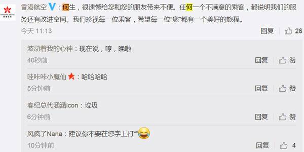 3月14日上午11时,香港航空官方微博账号在“何猷君MarioHo”微博下方留言表示遗憾:“何生,很遗憾给您和您的朋友带来不便。任何一个不满意的乘客,都说明我们的服务还有改进空间。我们珍视每一位乘客,希望每一位“您”都有一个美好的旅程。”