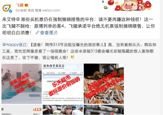 近日,飞猪官方微博转发了一条“机票捆绑搭售问题损害消费者权益”的微博,飞猪官微喊话称“@哪些卖机票扔在强制捆绑搭售的平台:请不要再赚这种钱啦!”疑似剑指携程去哪儿的机票强制捆绑搭售。笔者查看原微博下方评论,多涉及携程和去哪儿的强制搭售问题,消费者怨声载道。