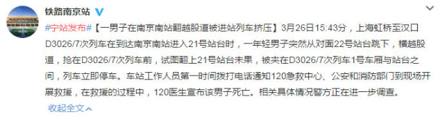 铁路南京站微博通报【一男子在南京南站翻越股道被进站列车挤压】