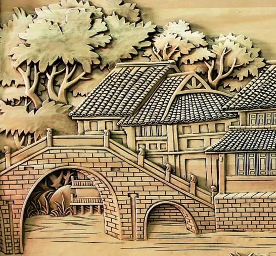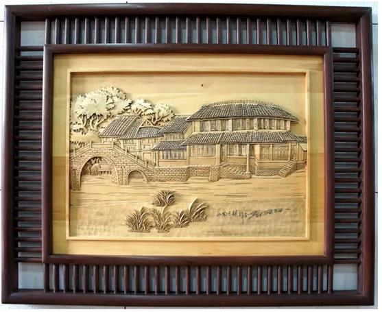 在黄小明木雕艺术馆的墙上,挂着一件东阳木雕作品《江南古镇》,这是黄小明大师创作的速写木雕系列中的一件,也是黄小明大师最喜欢的一件。