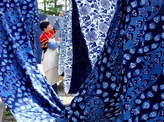 乌镇的蓝印花布是最有名的,黄小明大师走进一间庭院,这里是一座染织作坊的晒场,只见纵横交错的竹竿上晾晒的几十挂蓝印花布随风飘曳,犹如一群舞者的优美舞姿。