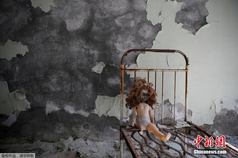 核爆炸后,约有4万7千人从普里皮亚季城撤走。乌克兰政府将于2017年4月26日纪念切尔诺贝利核事故31周年。图为被放置在废弃幼儿园铁床上的玩偶。