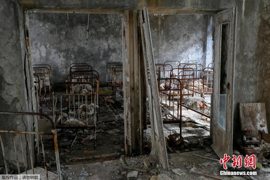 在普里皮亚季城里一个废弃的幼儿园内,有好事游客将玩偶放在锈迹斑斑的床上,画面荒凉恐怖。